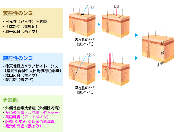 QスイッチNd:YAG(ヤグ)レーザーは、2種類の波長(532nm、1064nm)を有し、シミやアザの原因である
