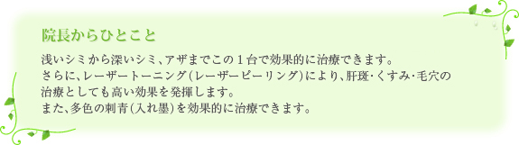 |院長からひとこと|QスイッチNd:YAG(ヤグ)レーザーとは|適応症状|特徴|治療の流れ|