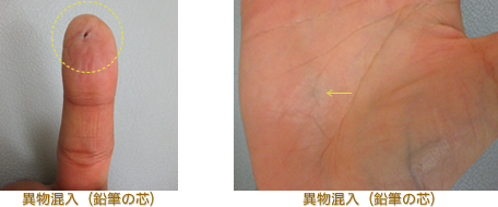 交通事故や転倒などの外傷で傷に砂などの異物が混入したり、鉛筆の芯などが刺さった場合、これらの異物を除去しない状態で傷が閉じてしまう(治ってしまう)と、その異物は真皮内に埋め込まれて残ってしまうため、色素沈着を来してしまいます。これを「外傷性色素沈着症」といいます。